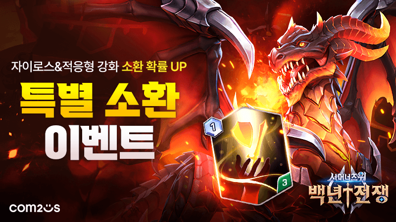 '백년전쟁'은 이번 업데이트를 기념해 신규 몬스터와 스펠을 보다 손쉽게 획득할 수 있는 이벤트를 마련했다. 유저들은 오는 28일까지 특별 소환 진행 시 동일 등급 내 다른 몬스터보다 높은 확률로 신규 몬스터와 스펠을 얻을 수 있으며, 특별 소환을 특정 횟수 진행 시, 자이로스 몬스터 카드 및 마나석을 추가로 획득할 수 있다.