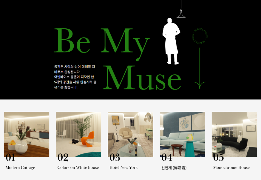 어반베이스 시공 서비스 ‘어반베이스 플랜’ 론칭 기념 이벤트로, 가상의 공간에 어울리는 5명의 ‘뮤즈’를 선정해 실제 공간 구현을 돕는다.