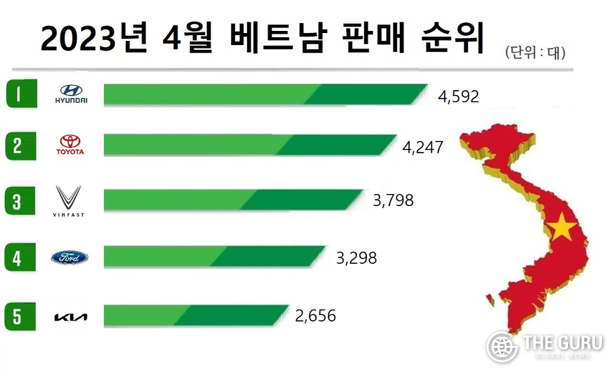 토요타는 총 4247대 판매로 2위를 기록했다. 현대차와 345대 차이로 주도권을 뺏겼다. 빈패스트는 3798대로 3위, 포드가 3298대로 4위에 이름을 올렸다. 기아는 2656대로 5위를 차지했다.