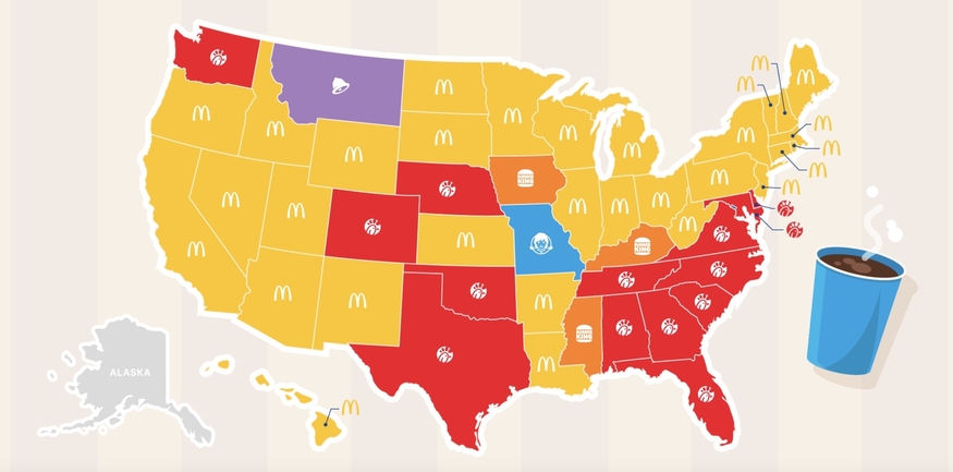 [더구루=김형수 기자] 맥도날드가 조식 패스트푸드 1위에 이름을 올렸다. 미국 50개주 가운데 절반이 훌쩍 넘는 30개주에서 선두를 달리며 2위를 기록한 칙필레(Chick-fil-A)를 큰 차이로 제쳤다.