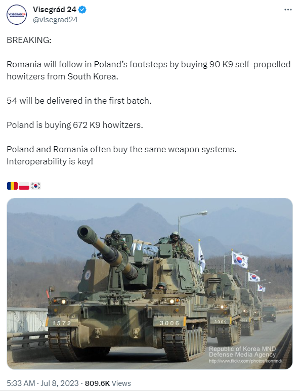 10일 디펜스루마니아를 비롯해 동유럽 매체 24비세그라드(Visegrád 24)에 따르면 루마니아 정부는 한국에서 K9 자주포 90문을 구매하기로 했다. 90문 중 54문이 먼저 인도된다.