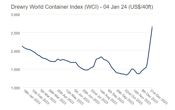 드류리는 "홍해·수에즈 사태로 인해 향후 몇 주 동안 동서간 스팟 운임이 상승할 것"이라고 분석했다.