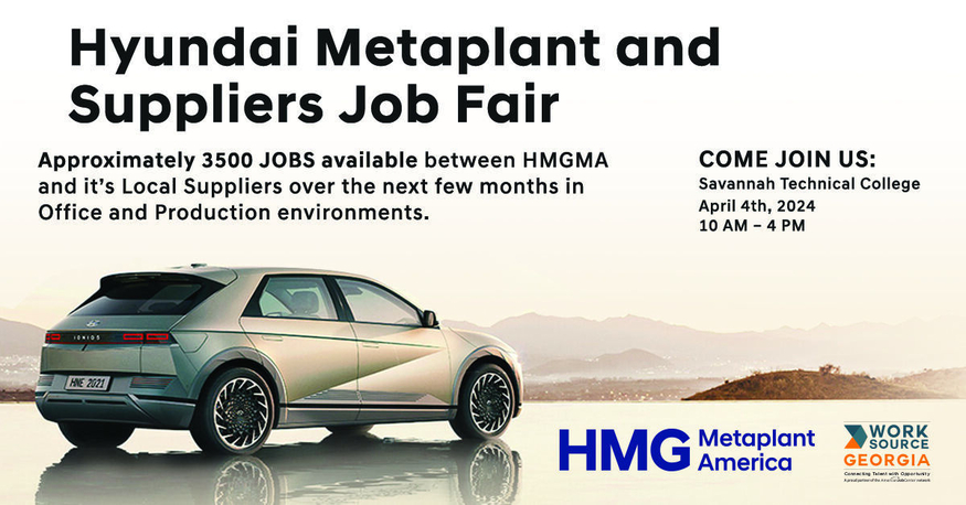 1일 미국 조지아주 인력 개발 기관인 '워크소스 조지아(Worksource Georgia)'에 따르면 HMGMA는 오는 4일(현지시간) 오전 10시부터 오후 4시까지 조지아주 '사바나 기술 대학(Savannah Technical College)'에서 채용 박람회를 연다. △현대글로비스 △현대머티리얼 △현대제철 △현대트랜시스 △현대모비스 △아진산업 △대창시트(DSC) △에코플라스틱 △한온시스템 △경신그룹 △PHA △서한오토 △서연이화 △세화 등 현대자동차그룹 계열사와 협력사들이 대거 참석한다.