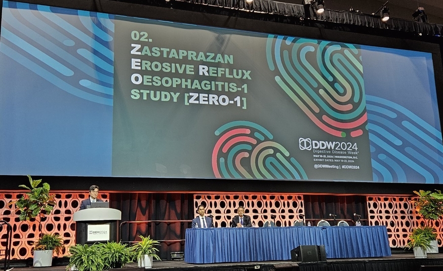 이번 발표는 오정환 은평성모병원 소화기내과 교수가 진행했으며, 미란성 위식도역류질환 환자를 대상으로 자스타프라잔(자큐보)과 에소메프라졸을 비교하여 유효성과 안전성을 평가하기 위한 3상 임상시험 결과를 분석하는 내용으로 이뤄졌다.