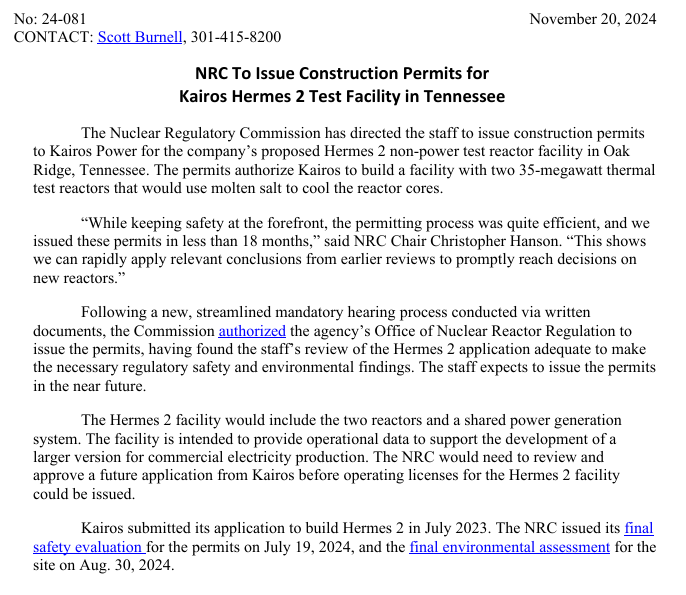 [더구루=오소영 기자] 미국 소형모듈원자로(SMR) 회사 '카이로스 파워(Kairos Power)'가 현지 규제 당국으로부터 두 번째 원전 건설 허가를 획득했다. 이르면 2027년 3분기부터 1·2호기를 순차 가동한다. SMR 상용화를 선도하며 구글의 데이터센터 가동을 지원한다.