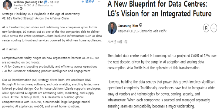 [더구루=오소영 기자] LG전자 경영진이 인공지능(AI) 데이터센터 시장을 겨냥해 '원(ONE)LG' 비전 전파에 나섰다. 조주완 사장에 이어 김재승 아시아지역 대표(전무)도 소셜네트워크서비스(SNS)를 활용해 냉각과 에너지저장장치(ESS) 등을 포괄하는 통합 패키지의 강점을 홍보했다. 미래 사업으로 AI 데이터센터용 냉각 솔루션을 키우며 글로벌 수주 확대를 위해 똘똘 뭉쳤다.