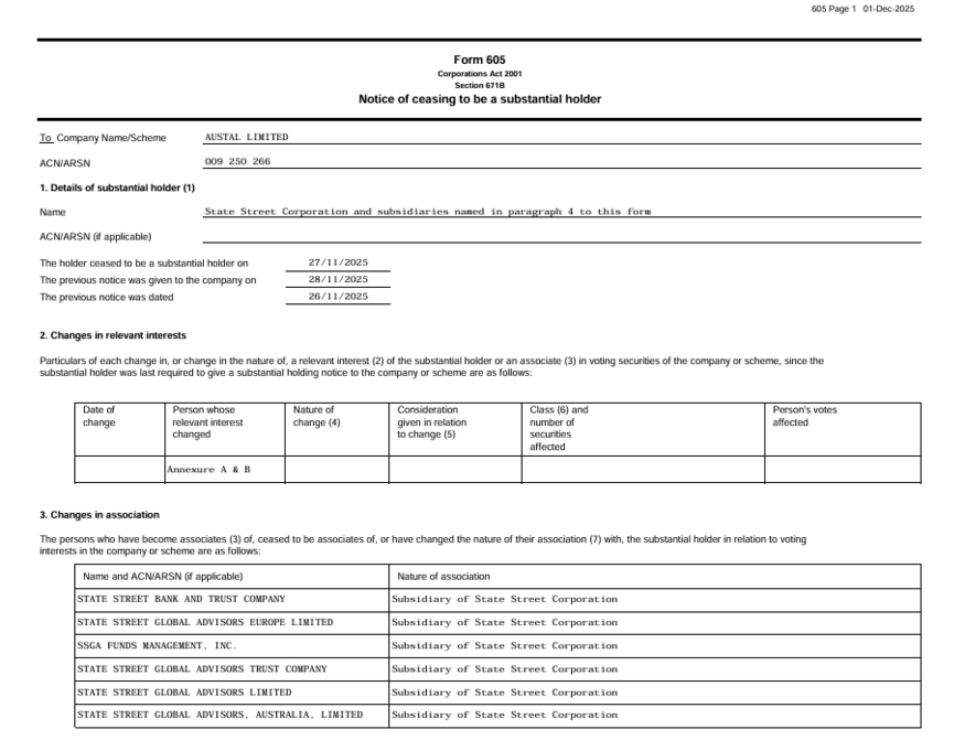 [더구루=오소영 기자] 미국 스테이트 스트리트 코퍼레이션(State Street Corporation, 이하 스테이트 스트리트)이 글로벌 조선·방산업체 오스탈(Austal)의 주요 주주에서 제외됐다. 한화의 지분 확대 움직임과 맞물려 오스탈 지배구조의 변화가 전망된다.