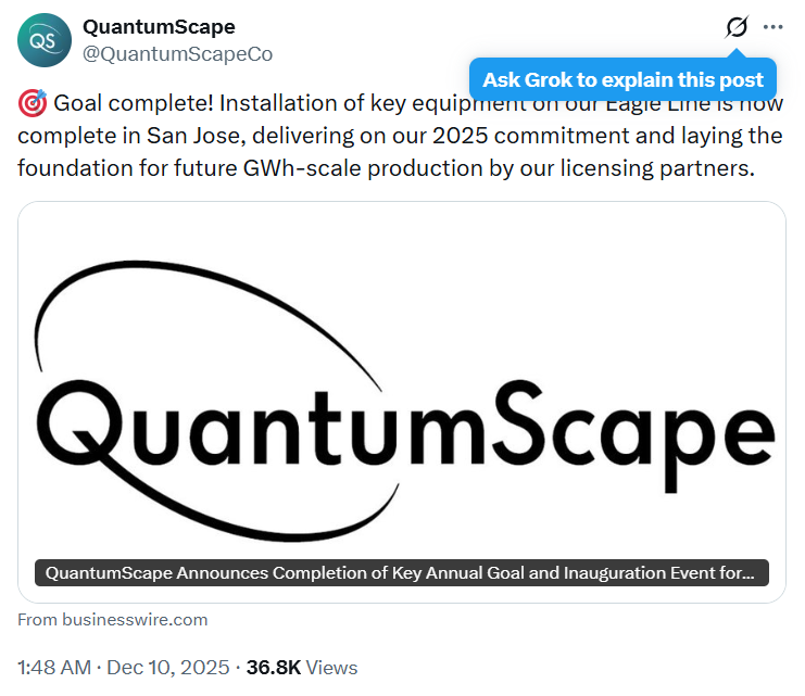 [더구루=길소연 기자] 미국 전기차 배터리 스타트업인 퀀텀스케이프(QuantumScape)가 전고체 배터리 상용화를 위한 핵심 인프라를 구축하며 대량 생산에 속도를 낸다. 고도로 자동화된 파일럿 생산라인 '이글 라인'(Eagle Line)을 구축해 QSE-5 셀 생산량 증대로 고객 수요를 충족한다.