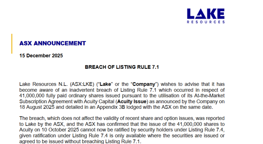 [더구루=오소영 기자] 호주 광산업체 레이크리소시스(Lake Resources)가 신주 발행 과정에서 상장 규정을 어긴 것으로 드러났다. 어큐이티 캐피털(Acuity Capital)과의 계약 체결 후 4100만 주를 발행하면서 한도를 잘못 계산한 것이다. 사업 운영에는 타격이 없으나 내부 교육과 절차를 강화해 유사 사례를 방지하겠다고 밝혔다.