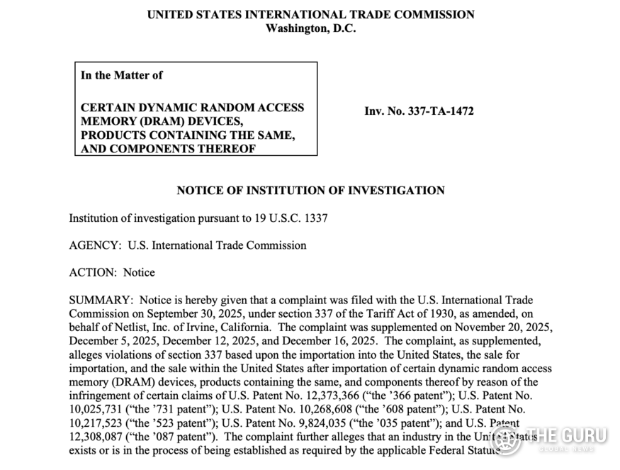[더구루=정예린 기자] 삼성전자의 미국향 고대역폭메모리(HBM) 공급 확대에 빨간불이 켜졌다. 미국 국제무역위원회(ITC)가 '특허괴물' 넷리스트의 제소를 받아들여 삼성전자 등에 대한 조사에 착수, HBM을 포함한 고성능 메모리 제품의 미국 수입·판매 제약 가능성이 현실적인 변수로 부각됐기 때문이다.