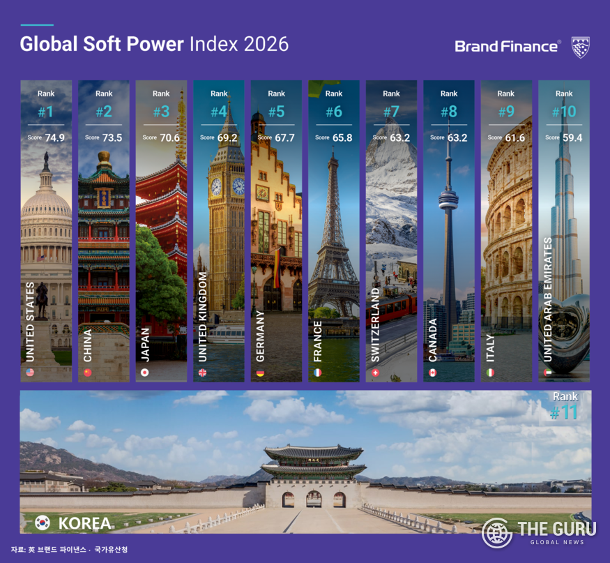 [더구루=정현준 기자] 대한민국이 올해 글로벌 소프트파워 강국 순위에서 '11위'에 올랐다. 지난해보다 한 단계 상승했으며, 기술 혁신 경쟁력과 문화 영향력이 긍정적으로 반영된 결과라는 분석이다.