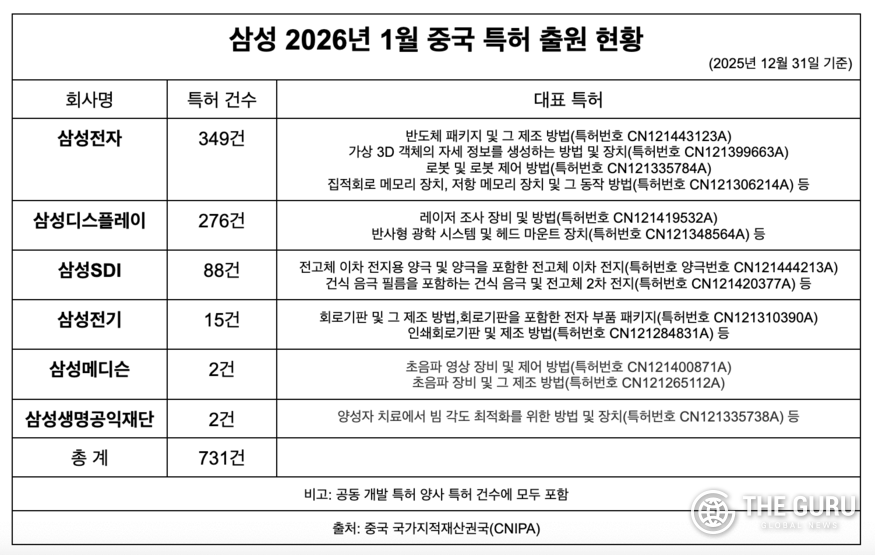 [더구루=정예린 기자] 삼성이 지난달 중국에서 700건이 넘는 특허를 승인받으며 반도체 공정·전고체 배터리·차세대 디스플레이 소재 등 미래 핵심 기술을 폭넓게 확보했다. 글로벌 소재·부품 기업과의 공동 개발 성과가 특허 승인으로 이어지며 차세대 반도체·배터리·디스플레이 분야에서 '기술 동맹' 전략의 성과가 가시화되고 있다는 평가다.