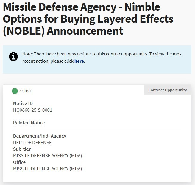 7일 업계에 따르면 미국 국방부 산하 미사일 방어국(Missile Defense Agency, MDA)은 최근 NOBLE(Nimble Options for Buying Layered Effects) 프로그램을 개시한다고 공고했다. MDA는 이번 공고를 통해 2030년까지 진행되는 5개년 조달 계획도 확립했다.