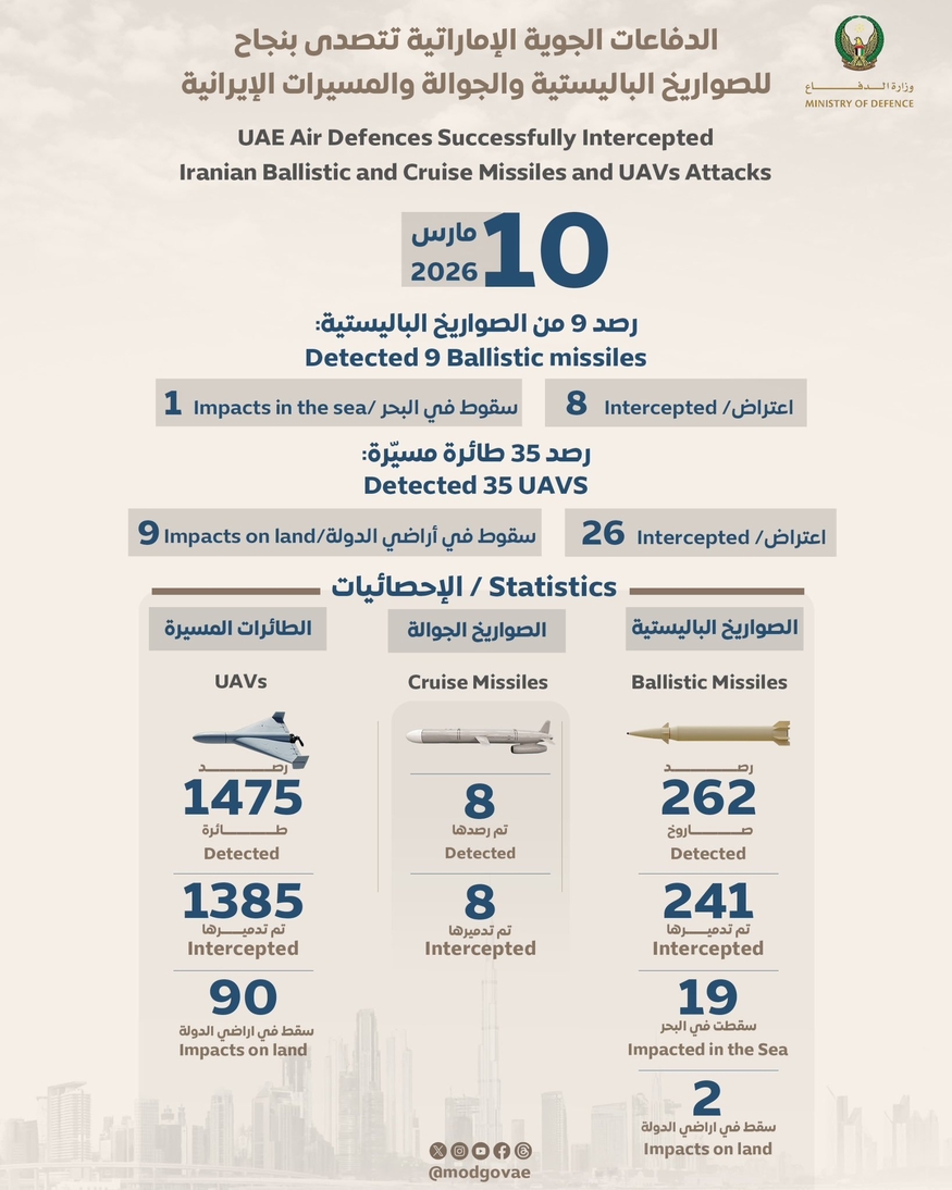 [더구루=오소영 기자] 아랍에미레이트(UAE) 국방부가 이란의 공습에 대응해 높은 요격 성과를 자랑했다. 탄도미사일과 무인기, 순항미사일을 감지해 상당수를 무력화했다고 과시했다. 국산 지대공 유도미사일 '천궁-Ⅱ'의 활약이 부각되면서 지난해 양국 정상회담에서 논의된 150억 달러(약 22조원) 규모 방산 수출이 가시화될 것으로 보인다.