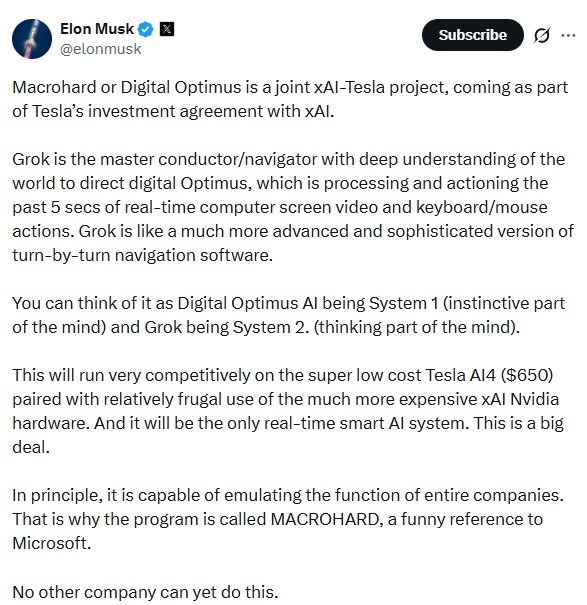 [더구루=홍성일 기자] 일론 머스크 테슬라 최고경영자(CEO)가 새로운 인공지능(AI) 프로젝트 '매크로하드(Macrohard)'에 대한 정보를 공개했다. 머스크는 매크로하드가 테슬라와 xAI가 공동으로 추진하는 프로젝트라고 소개하며, 업계에 엄청난 파장을 몰고올 것이라고 자신했다.
