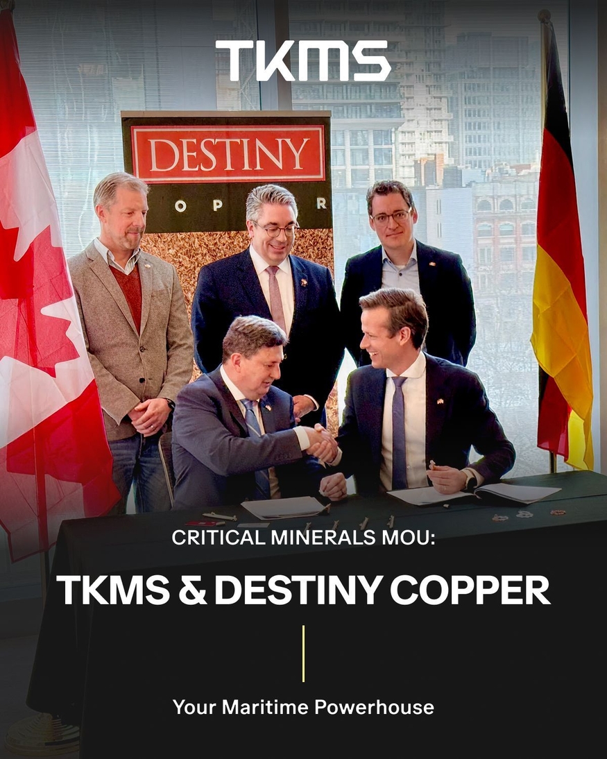 [더구루=오소영 기자] 독일 티센크루프마린시스템즈(TKMS)가 캐나다 데스티니 코퍼(Destiny Copper)와 광물 협력에 나선다. 데스티니 코퍼의 친환경 추출 기술을 활용해 국방·항공우주 등에 쓰이는 고순도 구리 확보를 추진한다. 지속가능한 광물을 매개로 경제·산업 협력 전선을 넓히며 캐나다 차세대 초계 잠수함 사업(CPSP) 수주를 노린다.