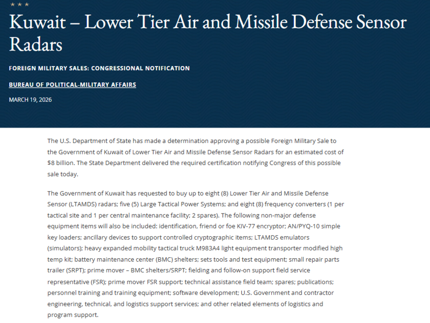 [더구루=오소영 기자] 쿠웨이트가 이란의 보복 공격에 대응해 대공 방어망 확충에 나섰다. 미국으로부터 차세대 레이더를 비롯해 80억 달러(약 12조원) 상당 무기체계를 주문했고 다른 국가와의 물밑 협상도 활발히 진행 중이다. 한국산 지대공 유도미사일 '천궁-Ⅱ'를 비롯해 중동에서 호평을 받고 있는 'K-방산' 무기체계를 도입할 가능성이 제기된다.