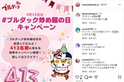 [더구루=김현수 기자] 삼양식품의 일본 현지 법인인 삼양재팬이 오는 13일 ‘불닭볶음면의 날’을 맞아 대규모 고객 감사 캠페인을 진행하며 현지 시장 내 브랜드 입지 강화에 나선다. 불닭볶음면 캐릭터인 ‘호치’를 앞세워 다양한 이벤트를 진행하고 현지 소비자들과 접점을 강화해 입지를 공고히 한다는 전략이다. 2일 삼양식품 일본법인 삼양재팬에 따르면 오는 13일 제4회 ‘불닭볶음면의 날’을 맞아 8일까지 SNS 캠페인을 진행한다. 불닭볶음면의 날은 삼양재팬이 지난 2022년 불닭볶음면 출시 10주년을 기념해 사단법인 일본기념일협회로부터 인증받아 제정한 기념일이다. 이번 SNS 캠페인은 직접 불닭볶음면 신제품을 제안하는 참여형이다. 캠페인 참여는 인스타그램과 X(구 트위터) 삼양식품 일본 공식 계정을 팔로우하고 이벤트 게시물 좋아요를 누른 뒤 ‘맛보고 싶은 새로운 불닭 맛’을 댓글로 남기면 된다. 추첨을 통해 △불닭볶음면 시리즈 세트와 호치 봉제 인형 △불닭 감자칩 세트 △아마존 불닭 쇼핑몰 10% 할인권 등을 413명에게 지급한다. 현지 반응은 뜨겁다. SNS 공식 계정에 해당 내용이 올라간 지 반나절 만에 좋아요와 게시글 공유 수가 합산 4000개를 돌파했고 2