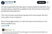 [더구루=홍성일 기자] 일론 머스크 테슬라 최고경영자(CEO)가 이끄는 인공지능(AI) 스타트업 xAI가 조직을 전면 개편했다. 이번 개편으로 xAI 사업부문은 △그록(Grok) △코딩 △이매진(Imagine) △매크로하드(Macrohard) 4개 핵심 축을 중심으로 재편됐다. 일각에서는 이번 조직 개편이 핵심 인력 퇴사로 인한 트리거(방아쇠)가 작용한 것 아니냐는 분석을 내놓고 있다.