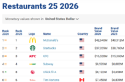 [더구루=진유진 기자] 맥도날드가 글로벌 레스토랑 브랜드 가치 순위에서 2년 연속 1위를 차지하며 세계 최대 외식 브랜드 자리를 지켰다. 고물가와 소비 둔화 환경 속에서도 가격 경쟁력과 디지털 전환, 글로벌 프랜차이즈 기반 등을 앞세워 브랜드 가치를 끌어올렸다는 평가다.