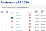 [더구루=진유진 기자] 맥도날드가 글로벌 레스토랑 브랜드 가치 순위에서 2년 연속 1위를 차지하며 세계 최대 외식 브랜드 자리를 지켰다. 고물가와 소비 둔화 환경 속에서도 가격 경쟁력과 디지털 전환, 글로벌 프랜차이즈 기반 등을 앞세워 브랜드 가치를 끌어올렸다는 평가다.