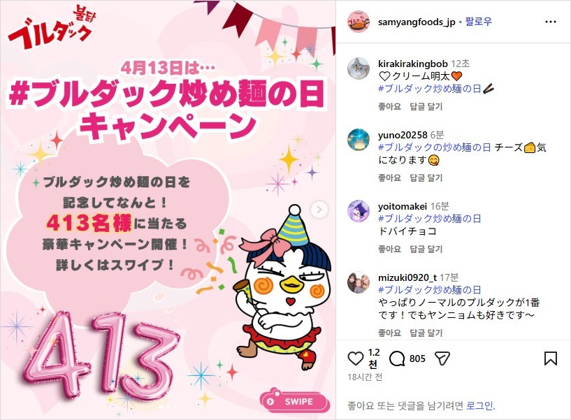 2일 삼양식품 일본법인 삼양재팬에 따르면 오는 13일 제4회 ‘불닭볶음면의 날’을 맞아 8일까지 SNS 캠페인을 진행한다. 불닭볶음면의 날은 삼양재팬이 지난 2022년 불닭볶음면 출시 10주년을 기념해 사단법인 일본기념일협회로부터 인증받아 제정한 기념일이다.
