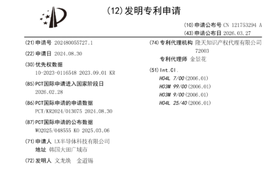 6일 중국 국가지식재산권국(CNIPA)에 따르면 LX세미콘은 최근 '데이터 처리 장치 및 데이터 구동 장치'에 관한 특허(공개번호 CN121753294A)를 공개했다. 해당 특허는 지난 2023년 9월 한국에서 선출원된 특허(10-2023-0116548)를 바탕으로 한 국제 특허(PCT)다. 지난 2024년 8월 국제 출원 후 올해 2월 중국 국가 단계에 진입하여 지난달 27일 최종 공고됐다.