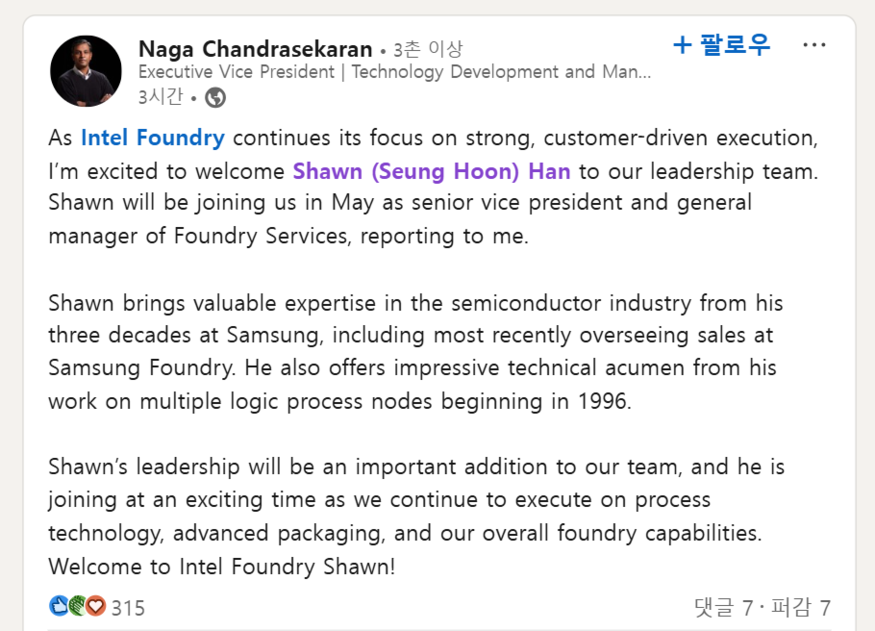 인텔은 17일 소셜미디어 '링크드인'을 통해 한승훈(숀 한·Shawn Han) 전 삼성전자 파운드리사업부 부사장이 내달부터 파운드리 부문 수석부사장(SVP) 겸 총괄 매니저로 합류한다고 밝혔다.