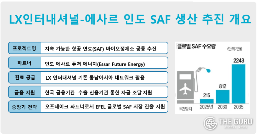 23일 업계에 따르면 LX인터내셔널과 에사르 퓨처 에너지(Essar Future Energy, 이하 EFEL)는 인도 뭄바이에서 SAF 바이오리파이너리(Biorefinery) 개발을 위한 업무협약(MoU)을 체결했다. 양사는 폐기물 기반 원료를 활용한 SAF 생산 시설의 기술적·상업적 기획은 물론, 원료 수급부터 최종 판매, 금융 조달에 이르는 전 과정에서 포괄적인 협력 체계를 가동하기로 했다.