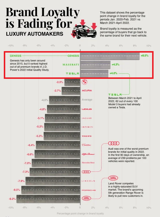 제네시스는 브랜드 충성도 상승도에서 1위를 차지했다. 재구매율 8.5%로 가장 높은 수치를 나타냈다. 세련된 디자인과 성능은 물론 타브랜드 대비 저렴한 가격으로 현지 운전자들을 사로잡았다는 평가를 받았다. 2위는 이탈리아 고급차 브랜드 마세라티가 이름을 올렸다. 재구매율 4.3%를 기록했다. 이어 테슬라가 재구매율 4.0%로 3위에 올랐다.
