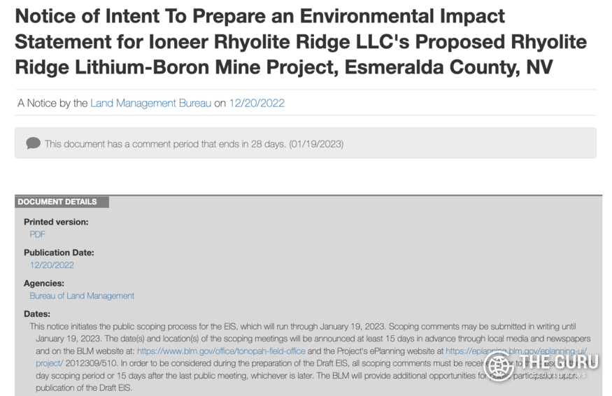 22일 아이오니어에 따르면 미국 토지관리국(BLM)은 최근 아이오니어가 추진중인 네바다주 '리오라이트 리지(Rhyolite Ridge) 리튬·붕소 프로젝트'에 대한 의향통지서(NOI)를 연방관보(Federal Register) 홈페이지에 게시했다. 의향통지서를 발행한 것은 연방정부가 인허가 최종 관문인 환경영향보고서(EIS)를 준비하고 검토할 것이라는 의미다.