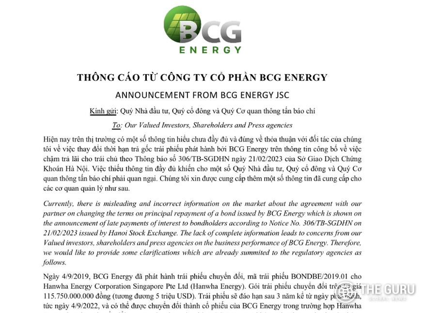 한화에너지는 2019년 9월 4일 BCG에너지로부터 1157억5000만동(약 65억원) 상당의 전환사채를 인수했다. 베트남 재생에너지 사업 개발에 쓸 자금을 마련하기 위해서다. 한화에너지는 2017년 6월 BCG에너지의 모회사인 BCG(Bamboo Capital Group)와 양해각서(MOU)를 맺고 베트남 롱안성에 100㎿ 규모의 태양광 발전사업을 추진해왔다. 전환사채 만기는 발행일로부터 3년인 2022년 9월 4일로 정해졌다.