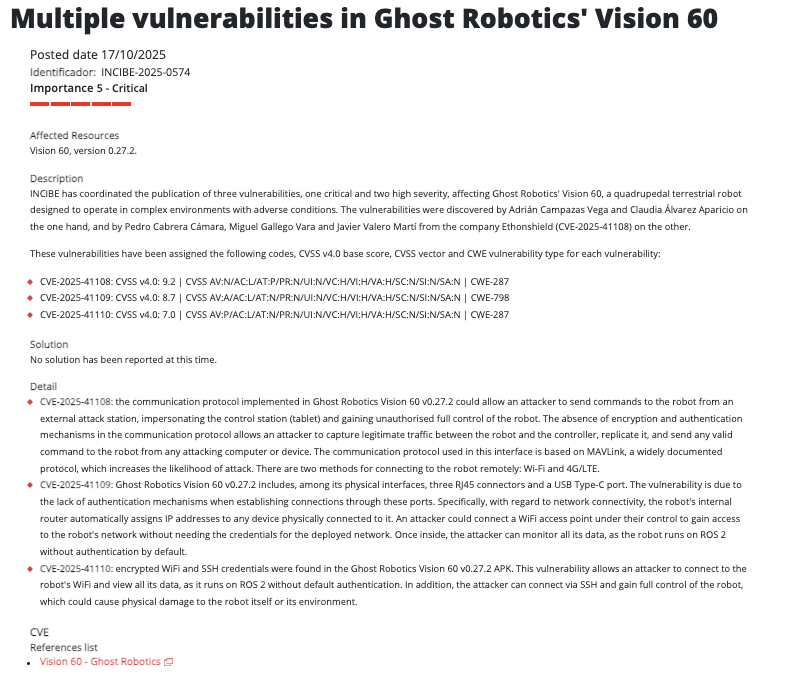 24일 스페인 국립 사이버 보안 연구소(INCIBE)에 따르면 고스트 로보틱스의 비전 60 버전 0.27.2에서 총 세 가지의 심각한 보안 취약점이 발견됐다.
