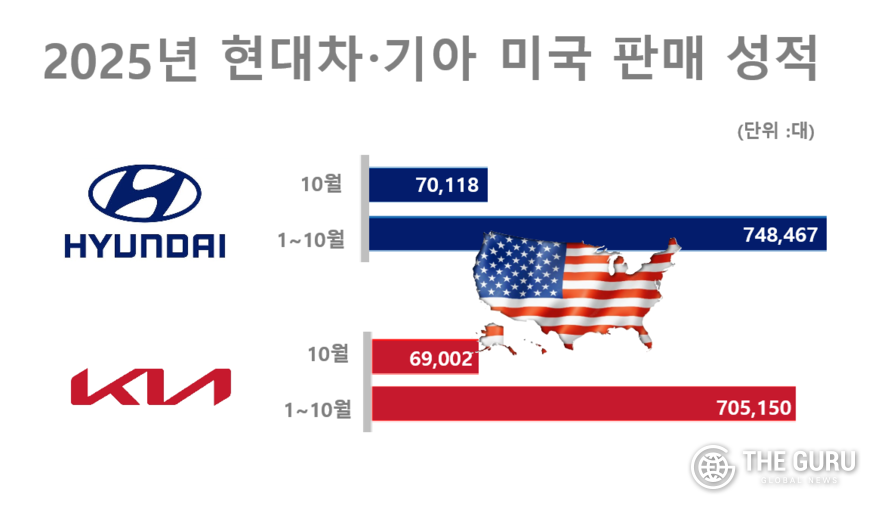 [더구루=김예지 기자] 현대자동차·기아가 10월 한 달간 미국에서 총 14만6137대를 판매, 선전했다. 현대차는 전년 동기 대비 2% 감소했으며, 기아는 0.1% 증가하면서 관세 충격 상황에서 강력한 판매 모멘텀을 유지했다. 올해 사상 최대 실적 달성이 유력하다.