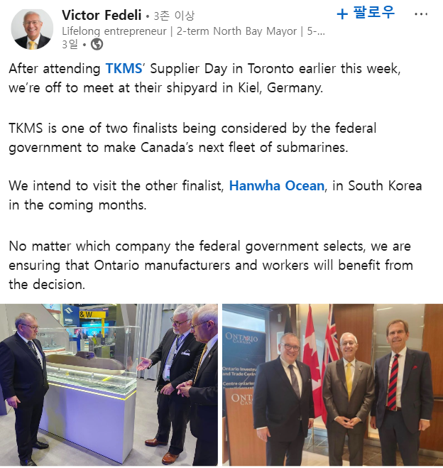 [더구루=오소영 기자] 캐나다 정부의 시선이 한화오션 거제조선소에 꽂혔다. 마크 카니 총리에 이어 빅터 페델리 온타리오주 경제개발부 장관도 한화오션 방문을 시사했다. 캐나다 차세대 잠수함 사업자 선정을 앞두고 주요 인사들의 발길이 이어지며 수주 전망에 힘이 실리고 있다.