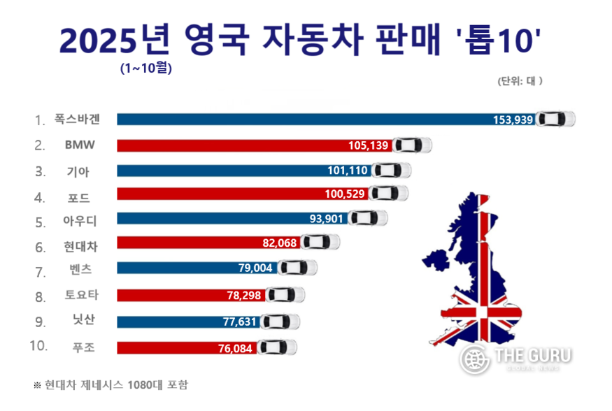 현대차 역시 견고한 판매 흐름을 이어갔다. 현대차는 지나달 한 달 동안 영국 시장에서 6056대를 판매했다. 10월 누적 판매량은 8만2068대(제네시스 1060대 포함)로, 6위(점유율 4.70%)를 기록했다. 양사 합산 점유율은 약 10.6%에 달했다.