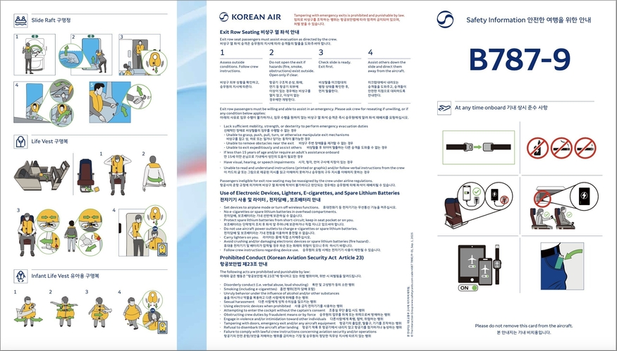 특히 이번 카드는 ‘90% 이해도’ 기준을 목표로 엄격한 승객 이해도 테스트를 거쳤다. 비상 상황에서 승객이 정확하고 명확한 안전 정보를 신속하게 파악하는 데 중점을 뒀다. 새 안전 카드는 이번달부터 대한항공 항공기에 순차적으로 적용되고 있다. 각 기종의 고유한 안전 기능과 구성에 따라 총 28가지 버전의 카드가 개발됐다.