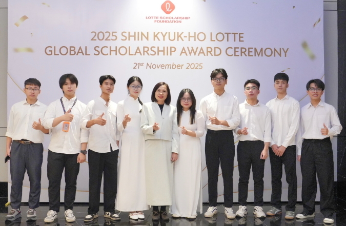 롯데장학재단은 지난 21일(현지시간) 베트남 하노이에서 현지 우수 및 저소득층 대학생 50명에게 총 2만2500달러(약 3000만 원) 상당의 장학금을 수여했다. 이번 장학금 수혜자는 하노이 과학대학교, 하노이 공과대학교, 하노이 교육대학교 등 5개 주요 대학에서 선발된 학생 50명이다.