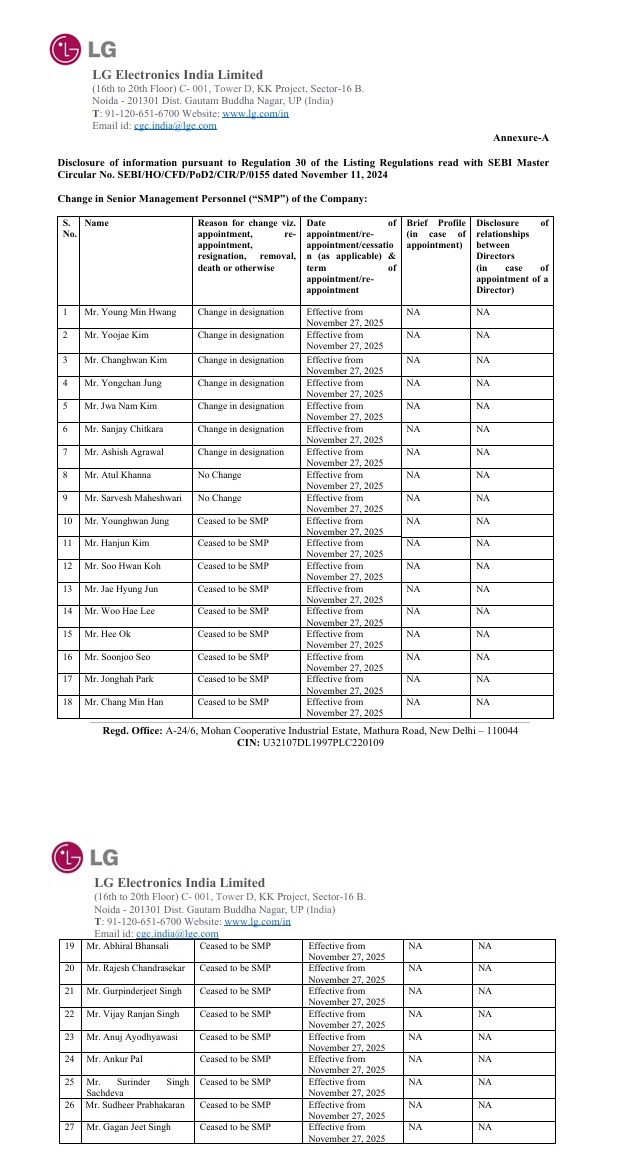 이와 함께 황영민 LG전자 인도법인 HS영업담당(상무) 역시 선임 경영진 역할이 재정립되어 핵심 영업 부문을 맡게 됐다. 김창환 상무는 고객 관리 및 서비스 책임자로 임명되어 LG의 서비스 인프라가 판매 성장과 동시에 확장되도록 보장하는 임무를 맡게됐다. 이전 인도 HR 책임자였던 김좌남 상무는 승진하여 LG전자 인도법인 최고 인사 책임자(CHRO)를 맡아 IPO 이후 시대의 인재 전략 및 조직 문화를 이끌게 되었다. 이번 인사는 기존 직원들의 사임이나 퇴사로 인한 변화가 아니며, 모든 직원은 회사에 계속 고용 상태를 유지한다.