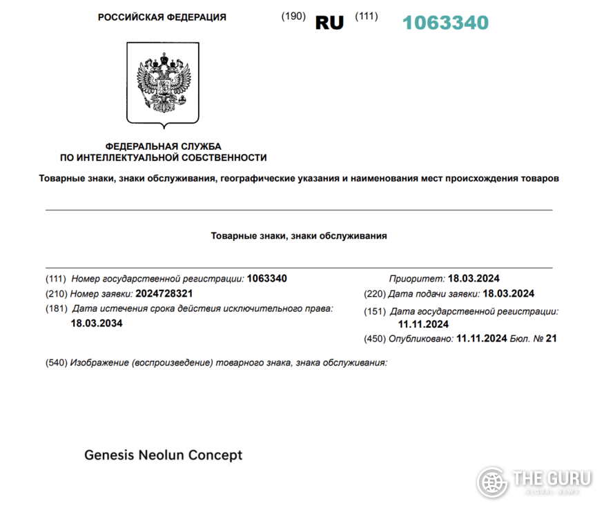 [더구루=정예린 기자] 현대자동차가 러시아에서 프리미엄 브랜드 제네시스의 콘셉트카 '네오룬(Neolun)' 관련 상표를 출원한 사실이 뒤늦게 확인됐다. 제네시스의 차세대 스포츠유틸리티차량(SUV) GV90과 관련한 디자인·기술 적용 가능성을 염두에 둔 것으로 조치로, 현대차가 러시아 시장 재진출을 위한 법적·상표적 기반을 마련한 것으로 해석된다.