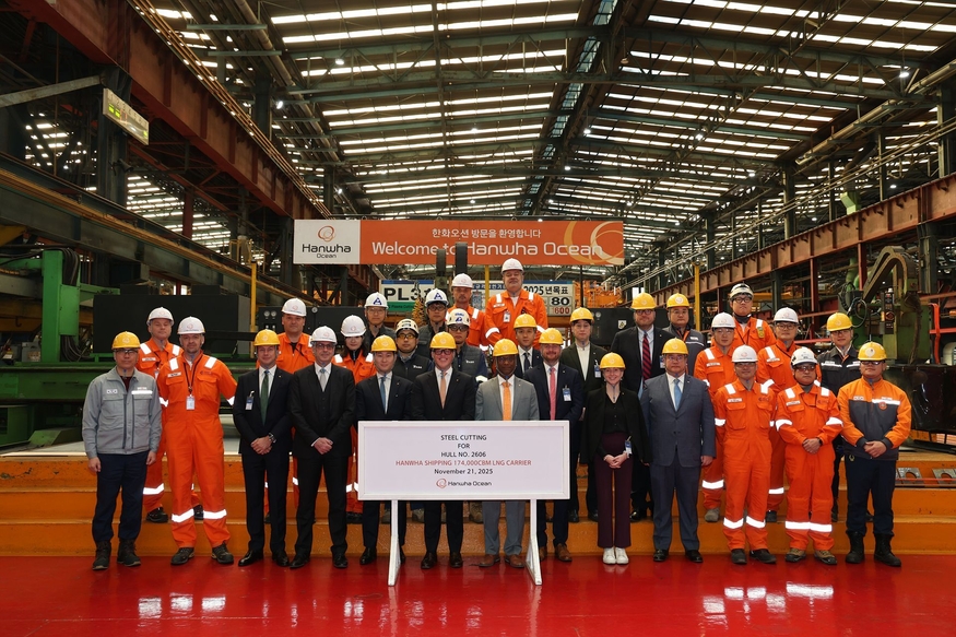 30일 한화해운에 따르면 지난 21일 한화오션 거제조선소에서 LNG 운반선 'H2606'의 강재 절단식을 열었다. H2606은 한화오션이 한화해운으로부터 수주한 LNG 운반선 4척 중 첫 번째다.