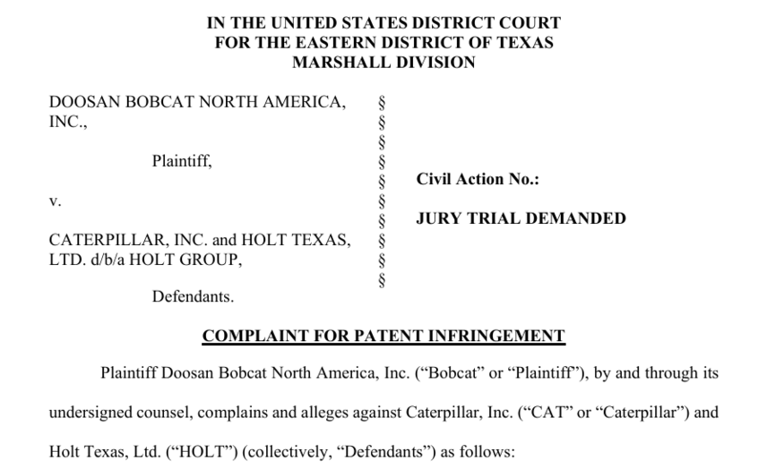 두산밥캣 북미법인(Doosan Bobcat North America, Inc)는 지난 2일(현지시간) 미국 연방 텍사스 동부지법(EDTX)과 국제무역위원회(ITC), 유럽 통합 특허법원(UPC), 독일 연방 법원에 총 14개 특허에 대한 소장을 일제히 제출했다고 밝혔다.