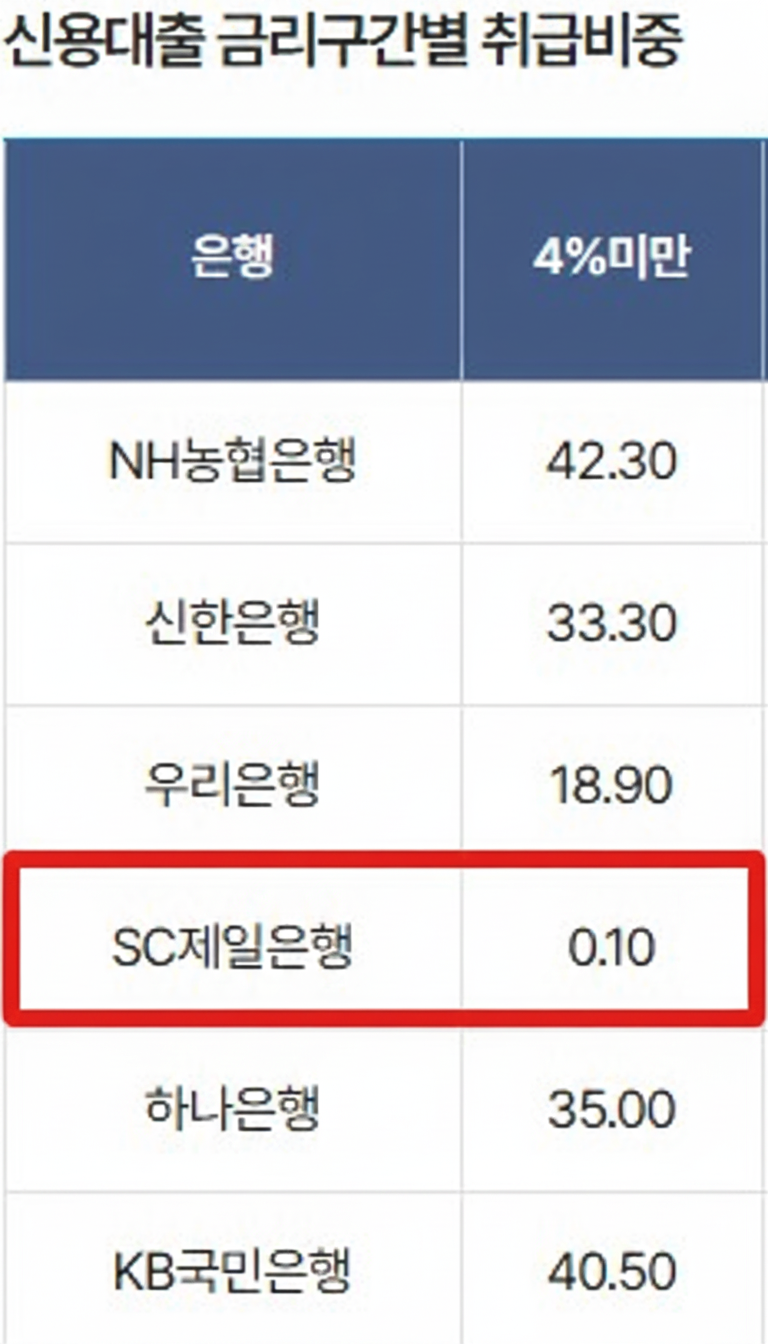 4일 은행연합회 ‘신용대출 금리구간별 취급비중’을 보면, 올해 10월 기준 SC제일은행의 4% 미만 금리 신용대출 비중은 0.1%에 그쳐 거의 없었다. 전월 0.4%에서 0.3%p나 낮아졌다.