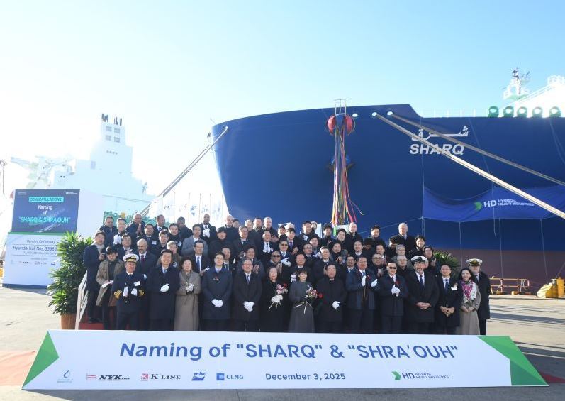 5일 러시아 해운전문지 포트뉴스(Portnews)에 따르면 HD현대중공업은 3일 울산조선소에서 카타르발(發) 신조선 17만4000m³급 LNG 운반선 2척의 명명식을 개최했다.
