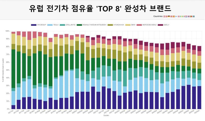4분기 기준 유럽 전기차 1위는 폭스바겐이며, 점유율은 29.6%에 달한다. 2위는 8.9%를 기록한 BMW이며, 이어 스텔란티스(8.57%), 테슬라, 현대차·기아, 지리 등 순으로 나타났다. 르노-닛산-미쓰비시 얼라이언스는 6.1%를 기록했다.