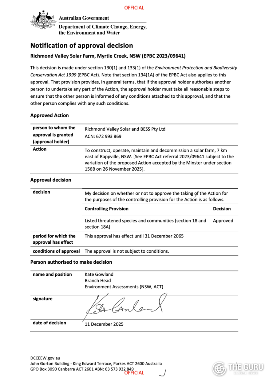 17일 호주 기후변화에너지환경수자원부(DCCEEW)에 따르면 DCCEEW는 최근 뉴사우스웨일스(NSW)주 머틀 크릭(Myrtle Creek) 인근에 조성되는 리치몬드 밸리 태양광·BESS 프로젝트에 대해 환경보호·생물다양성보전법(EPBC Act)에 따른 최종 승인 결정을 내렸다. 승인 대상은 태양광 발전소와 배터리 에너지저장장치의 건설·운영·유지·해체 전 과정이며, 추가 조건은 부과되지 않았다.