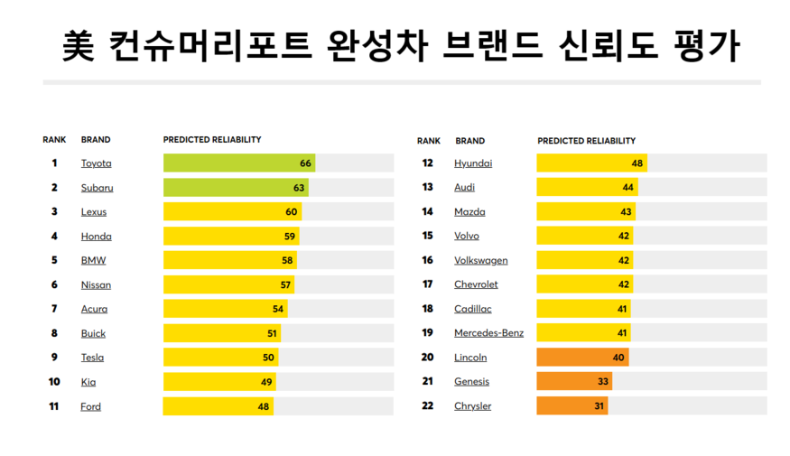 1위는 토요타가 차지했다. 총 66점을 획득하며 정상을 탈환했다. 스바루는 63점으로 2위, 렉서스는 60점으로 3위에 올랐다. 혼다와 BMW는 각각 59점과 58점으로 4위와 5위를 기록했다. 6위부터 9위까지는 △닛산(57점) △아큐라(54점) △뷰익(51점) △테슬라(50점) 순으로 이어졌다.