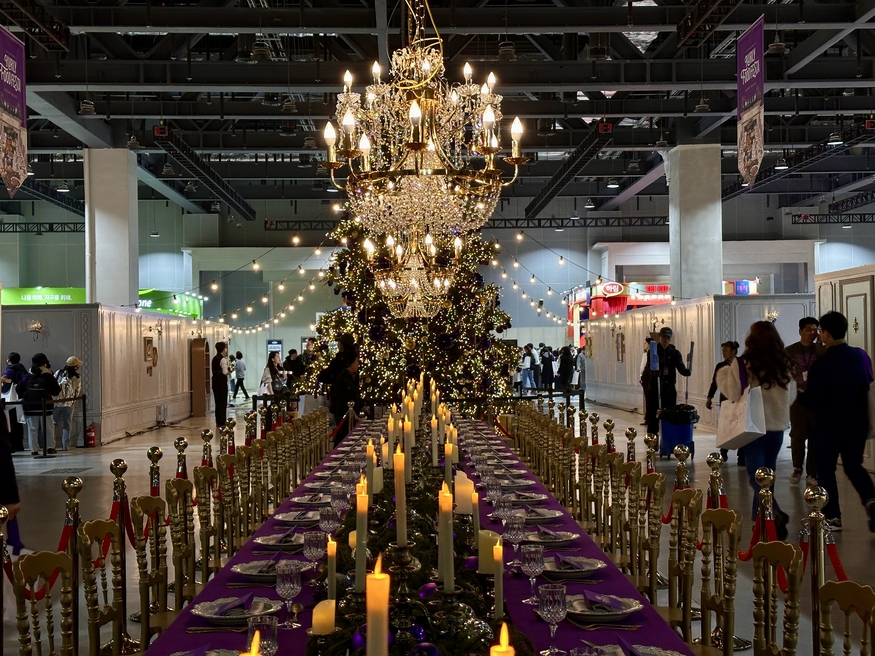 [더구루=진유진 기자] 19일 오전 서울 강서구 코엑스 마곡 르웨스트. 개장을 기다리는 관람객들의 '오픈런' 줄이 전시장 앞에 길게 이어졌다. 문이 열리자 캐럴과 함께 연말 분위기를 가득 채운 대형 크리스마스 트리가 시선을 사로잡았다. 트리 옆으로는 길게 늘어선 '홀리데이 테이블(Holiday Table)'과 식음료(F&B) 부스가 이어졌고, 관람객들은 커다란 컬리 장바구니를 손에 든 채 자연스럽게 동선을 따라 움직였다.
