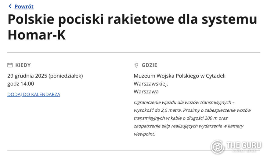 29일 폴란드 국방부에 따르면 이날 오후 2시(현지시간) 바르샤바에서 호마르-K(폴란드형 천무 발사대) 운용을 위한 CGR-080 공급 계약 서명식이 열린다. 행사에는 강훈식 대통령 비서실장 및 국방부 관계자들로 구성된 우리 정부 대표단과 브와디스와프 코시니악 카미슈 폴란드 부총리 겸 국방부 장관, 파벨 베이다 국방부 차관 등이 참석한다.