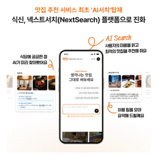 이번 개편에서 가장 눈에 띄는 변화는 메인 화면의 파격적인 전환이다. 식신은 지난 2013년 서비스 시작 이후 12년간 축적해 온 방대한 맛집 데이터에 대한 자신감을 바탕으로, 첫 화면을 검색창 중심으로 재편했다. 기존의 복잡한 콘텐츠들을 걷어내고, 사용자가 원하는 바를 검색창에 입력하기만 하면 탐색이 완료되는 구조다. AI 서치 기능은 친구에게 묻듯 자연어로 질문하면 사용자 의도와 맥락을 파악해 가장 알맞은 식당을 정교하게 추천한다. 단어 매칭이 아닌, 상황 이해 기반의 결과 제공이 특징이다.